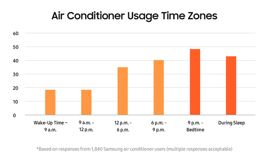 The survey also highlighted that air conditioners are most commonly used around bedtime, with nearly half (48%) of respondents using their units from 9 p.m. until they fall asleep, and 42% using them throughout the night.
