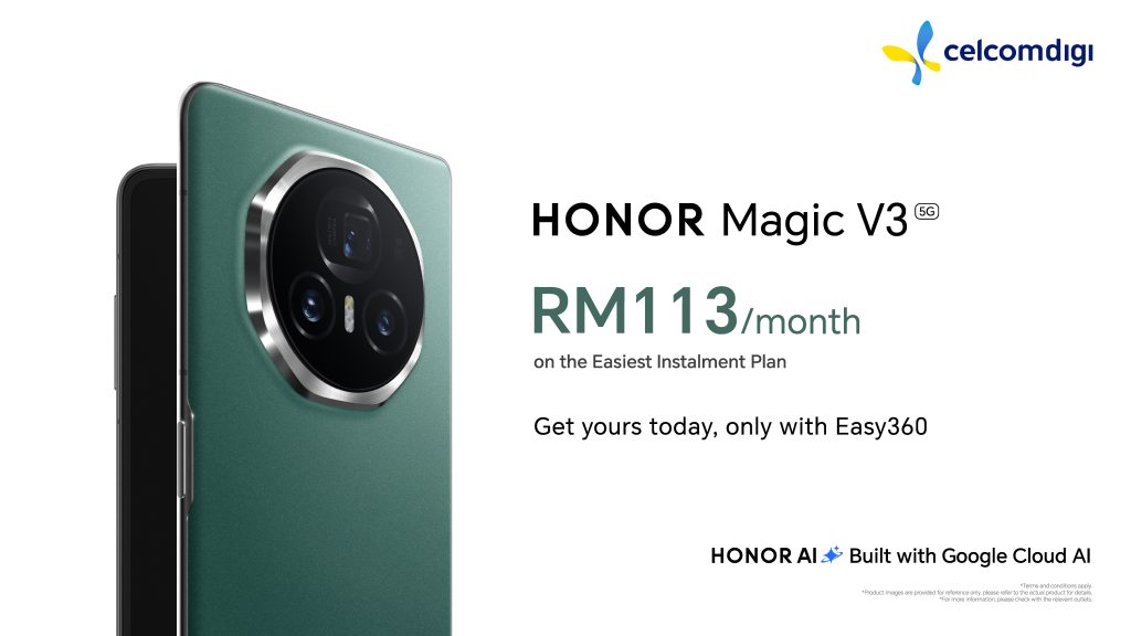 - CelcomDigi: Own the HONOR Magic V3 for RM113 per month, RM0 upfront, and 0% interest with Easy 360. More details available on the CelcomDigi website.