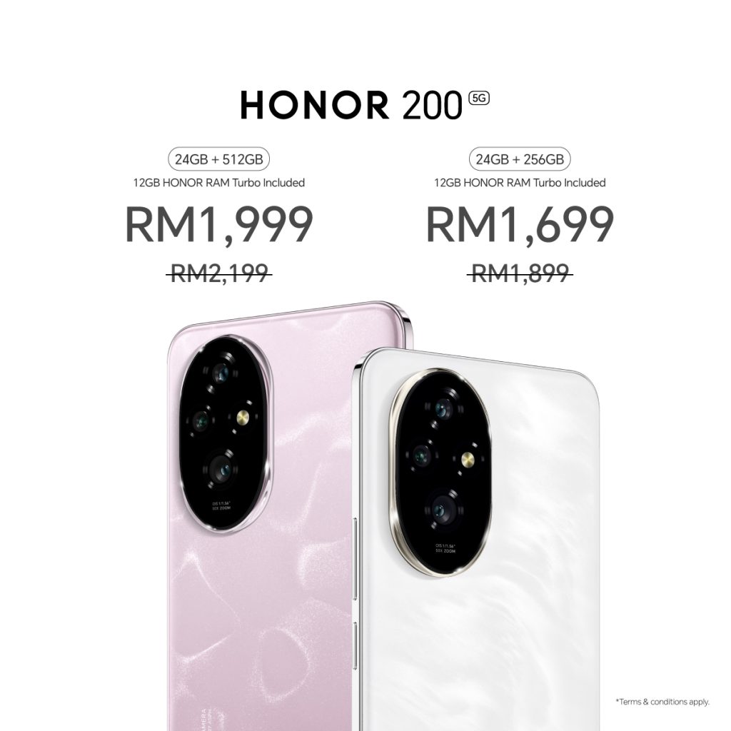 - HONOR 200 (12GB RAM + 512GB storage) is now priced at RM1,999 (previously RM2,199), while the 12GB RAM + 256GB storage model is RM1,699 (previously RM1,899). Both come in Coral Pink, Moonlight White, and Black.