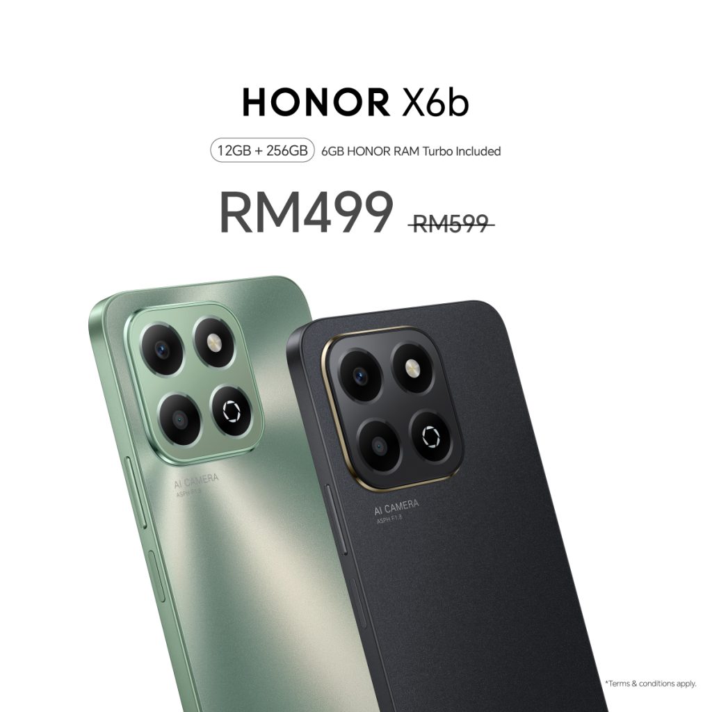 The HONOR X6b, featuring a 50MP AI Ultra-clear Camera, now retails for RM499 (previously RM599). Available in Forest Green and Midnight Black, it offers: