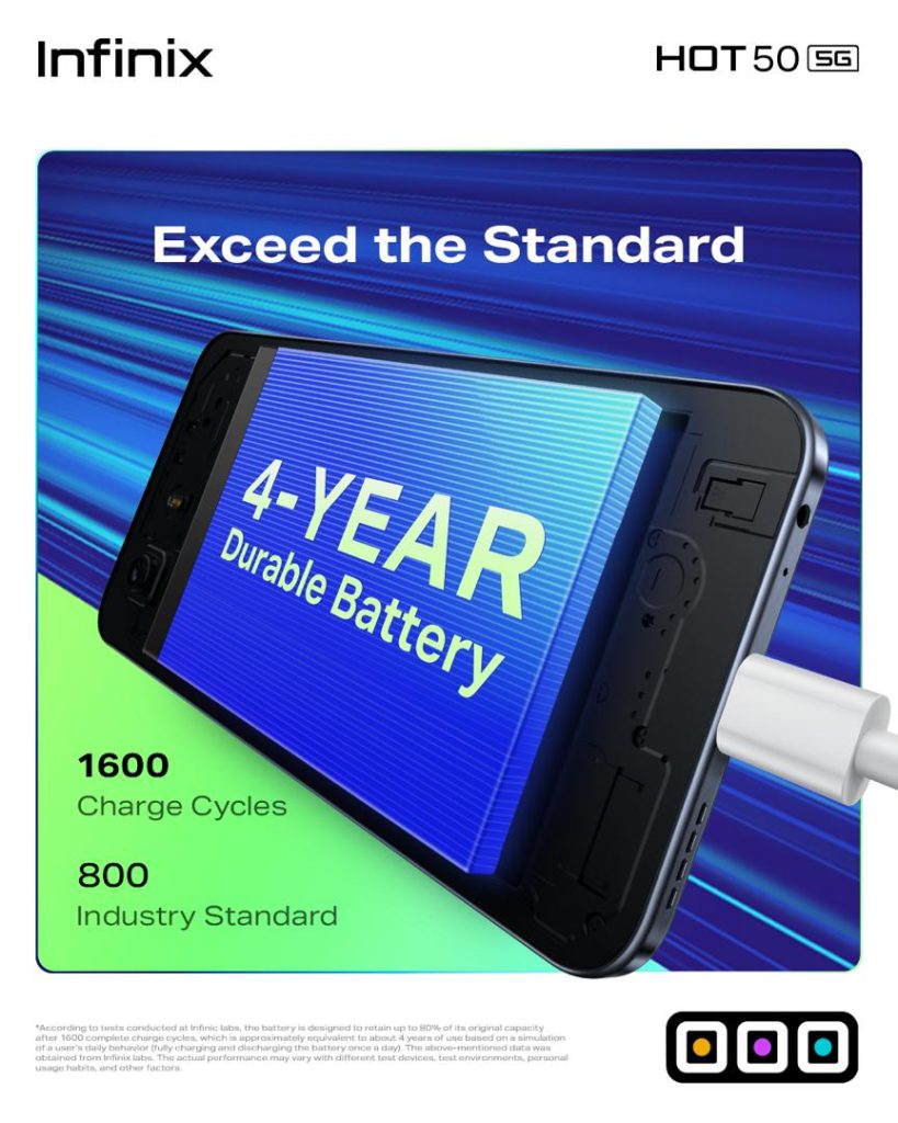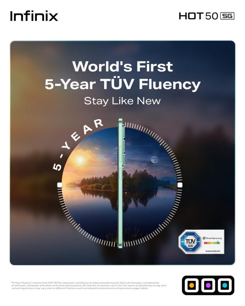 Designed for long-term performance, the Infinix HOT 50 5G is the world’s first smartphone to receive the TÜV SÜD 60-Month Fluency Certification, ensuring smooth and reliable operation for up to five years. It also features IP54 Dust & Splash Proof Protection, making it durable enough to withstand daily wear and tear.