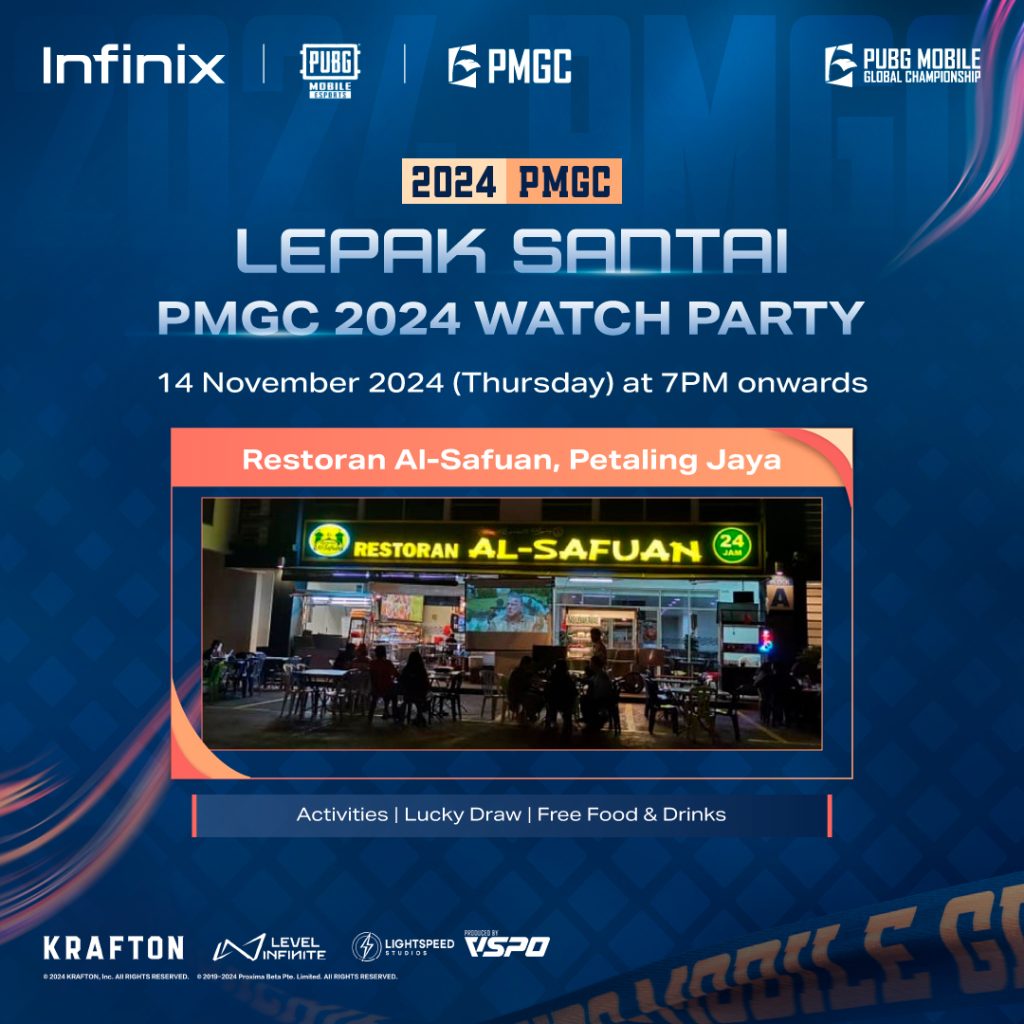Infinix is hosting the Lepak Santai PMGC 2024 Watch Party at Restoran Al-Safuan in Petaling Jaya on 14 November 2024, starting at 7 PM. Enjoy live match screenings, interactive activities, a lucky draw, and complimentary food and drinks while cheering on Team CelcomDigi Alliance as they represent Malaysia.