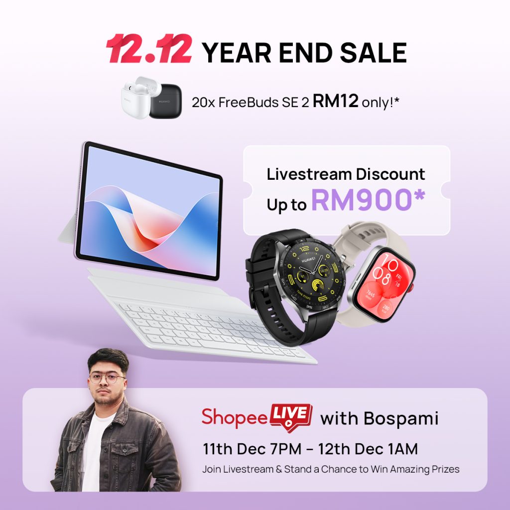 Join Huawei’s 12.12 Shopee Livestream on 11 December, 7:00 PM – 1:00 AM, for flash deals starting at just RM12! Grab free gifts like the HUAWEI Pura 70, WATCH GT 5, and WATCH FIT alongside exclusive discounts of up to RM500.