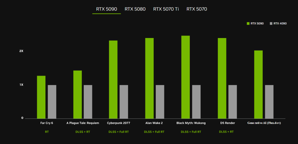 - FP4 Precision: Boosts AI model performance by 2x, enabling local generative AI workflows.