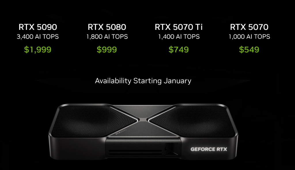 - GeForce RTX 5070 Ti: $749, launching February 2025.