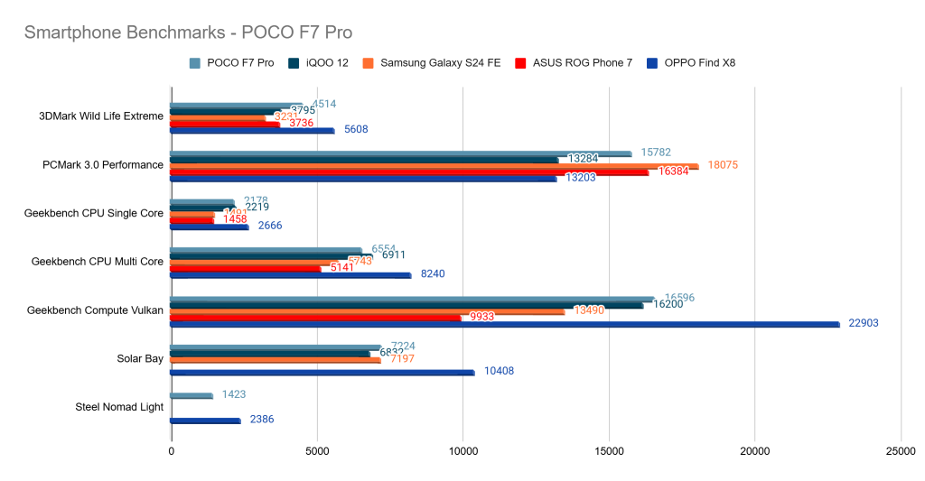 At its core, the Poco F7 Pro is powered by the Snapdragon 8 Gen 3 chipset, with up to 12GB of LPDDR5 RAM and 512GB of internal storage without any external MicroSD card expansion capabilities. As the POCO F7 Pro is using last year’s SOC, it is still plenty capable from the performance and optimization standpoint and this remains competitive even when compared with any phones within the price range.