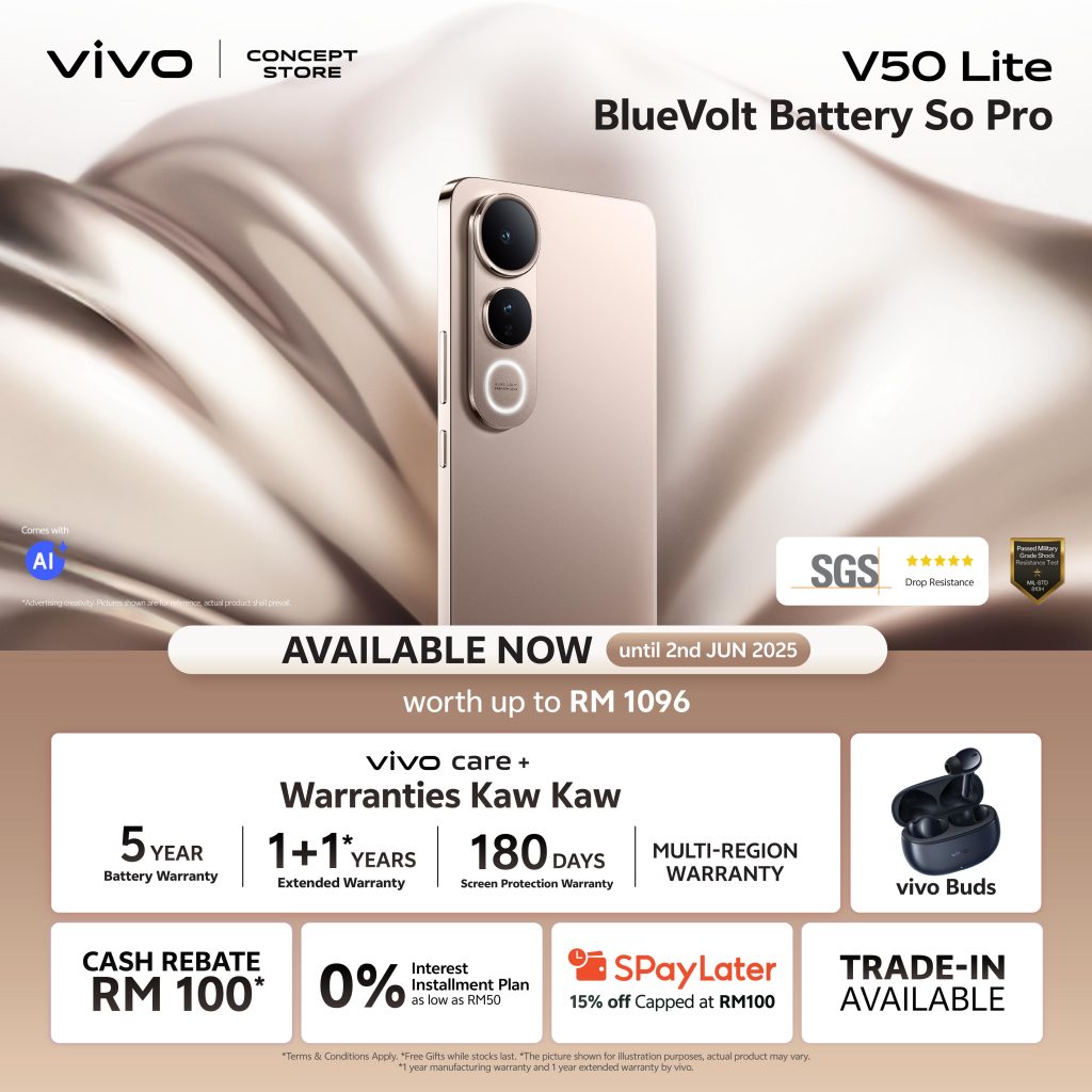 vivo Malaysia has officially launched the all-new vivo V50 Lite 5G, combining an ultra-slim design, flagship-level performance, and an industry-leading 6500mAh BlueVolt battery. Priced at RM1,299, this new addition to the V50 Series aims to deliver long-lasting power, fast charging, and stylish durability for Malaysian consumers.