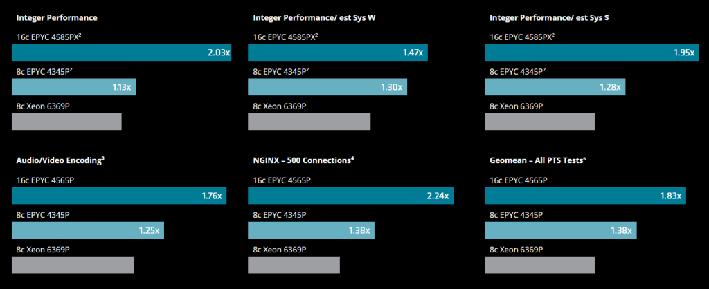 Built on the widely adopted AM5 socket, the new EPYC 4005 processors bring enhanced compute capabilities to a variety of form factors including servers, towers, and blades. With up to 16 “Zen 5” cores, these CPUs boast impressive performance gains—the 4565P outperforms the top 6th Gen Intel Xeon 6300P by up to 1.83x, according to Phoronix benchmark testing.