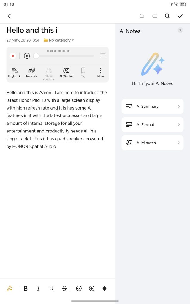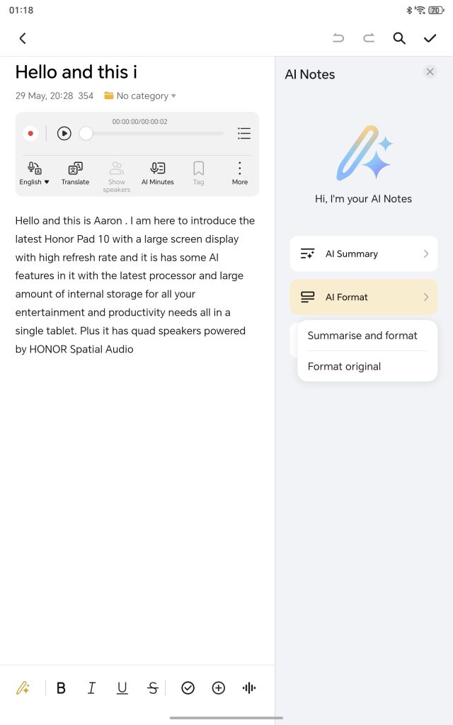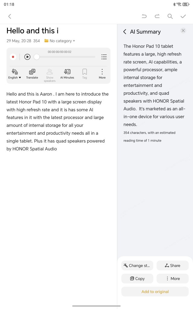 The HONOR Notes app recognizes various speakers by their voiceprints and instantly converts spoken content into text. Moreover, it facilitates multilingual translation, summarization, auto-formatting, and digital handwriting recognition for note cleanup and text conversion.