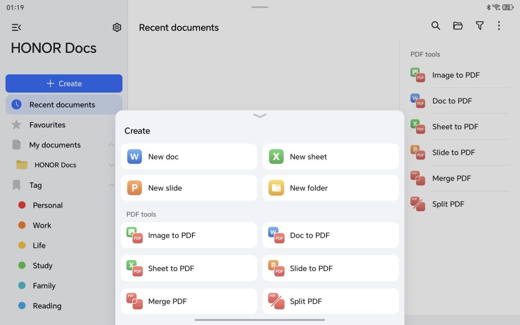 HONOR Docs allows users to create and edit documents, spreadsheets, and slides. It also allows users to convert scanned documents and photographs into PDFs. Even more features than those found in more conventional programs like Microsoft Word or WPS Office are included in the suite.