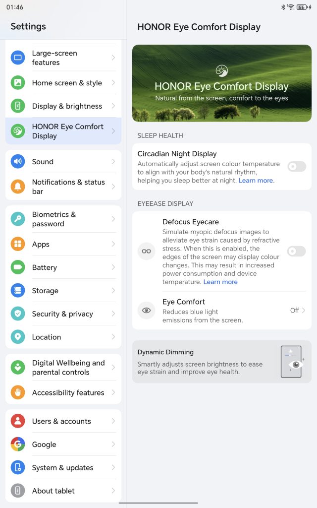 Honor places a strong emphasis on user comfort in addition to aesthetic perfection. TÜV Rheinland has approved the display for flicker-free operation and reduced blue light emissions. To safeguard the eyes during extended use, it also has features like Circadian Night Display, Dynamic Dimming, and AI Dynamic Display for adjustable brightness.