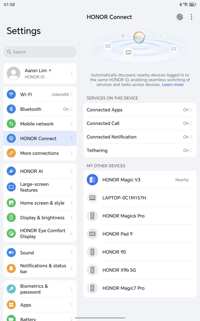 HONOR Connect facilitates a smooth cross-device ecosystem by allowing users to sync their tablet with other HONOR devices for functions including file transfers, screen sharing, and extended displays.