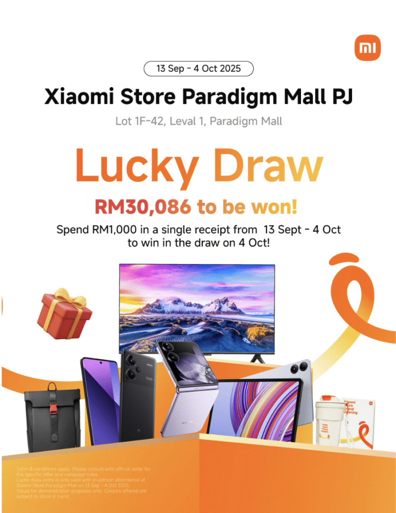 - Exclusive Lucky Draw: Shoppers who spend RM1,000 or more in a single receipt by 4 October will earn entries to win prizes like the Xiaomi MIX Flip, Note 13 Pro+, Redmi Pad 6, Xiaomi TVs, and more.