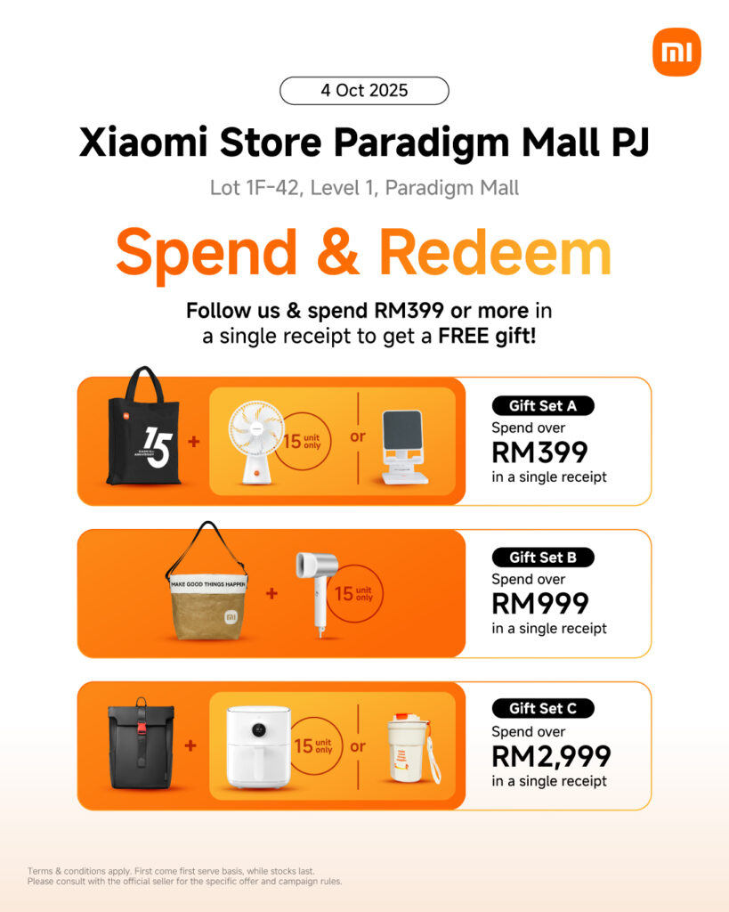 - Check-in & Get Free Gift: From now until 31 October, shoppers who share a photo of their visit on social media and tag @xiaomi.malaysia can redeem limited-edition gifts such as a Xiaomi keychain, cardholder, or 15th anniversary canvas bag (while stocks last).