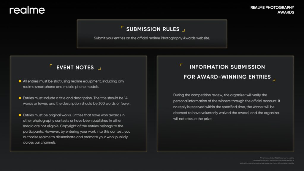 Participants can submit original photos with a title and short description via the official realme Photography Awards website.